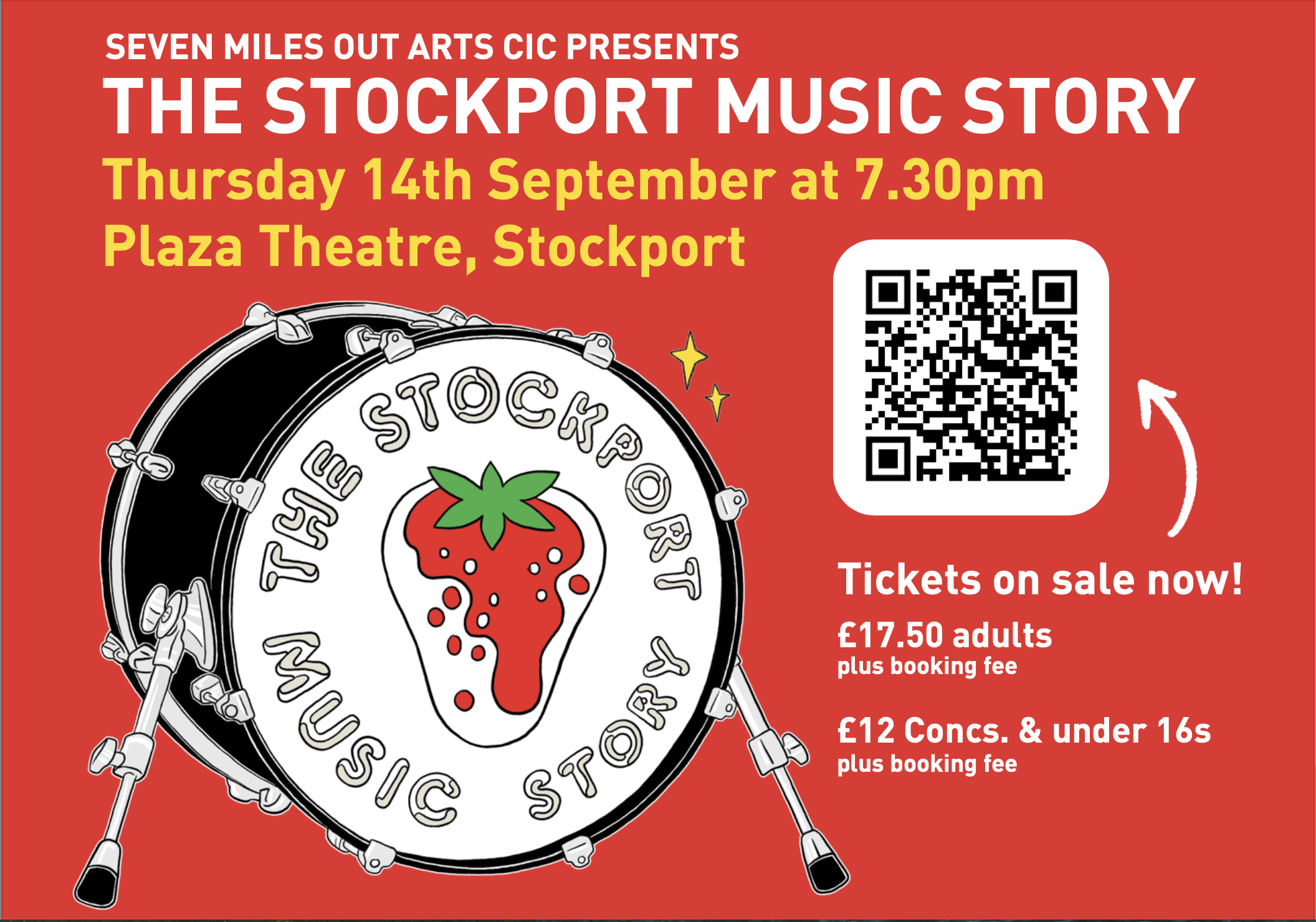 Supported by Arts Council England Lottery Fund and in collaboration with Stockport Town of Culture, British Drum Co, Seven Miles Out Records and Stockport Music Map. Tickets available through The Plaza box office.